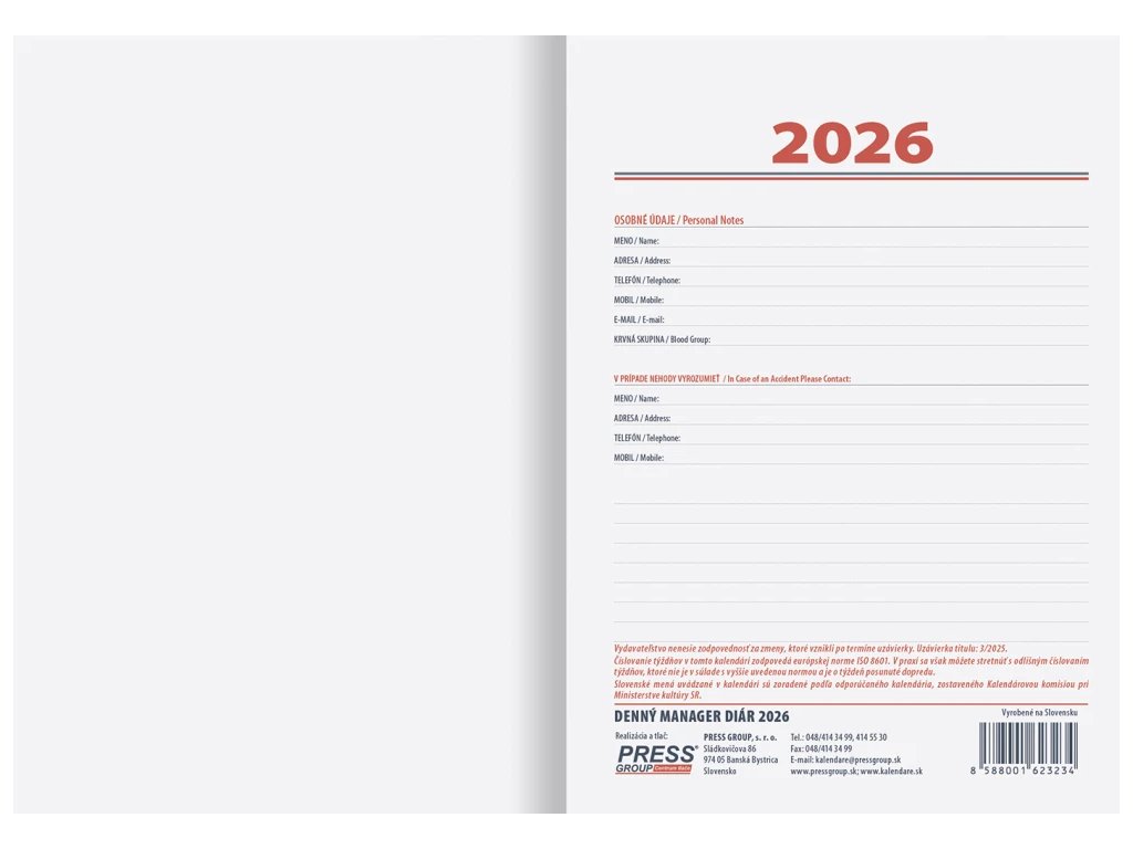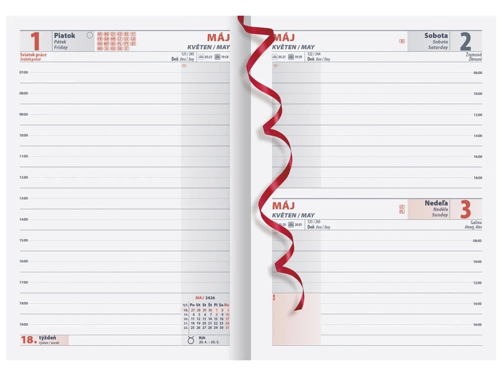 Denný diár vo formáte A5 s bohatým obsahom. Kvalitný diár s hodinovým delením (7:00 - 19:00) obsahuje slovenské a české kalendárium, anglický preklad mesiacov a dní, informácie o štátnych sviatkoch všetkých krajín EÚ, prehľadný a plánovací kalendár (fond pracovného času), školské prázdniny, prehľad slovenských EČV, adresár. Ponúka dostatočný priestor pre písanie poznámok a pripomienok.