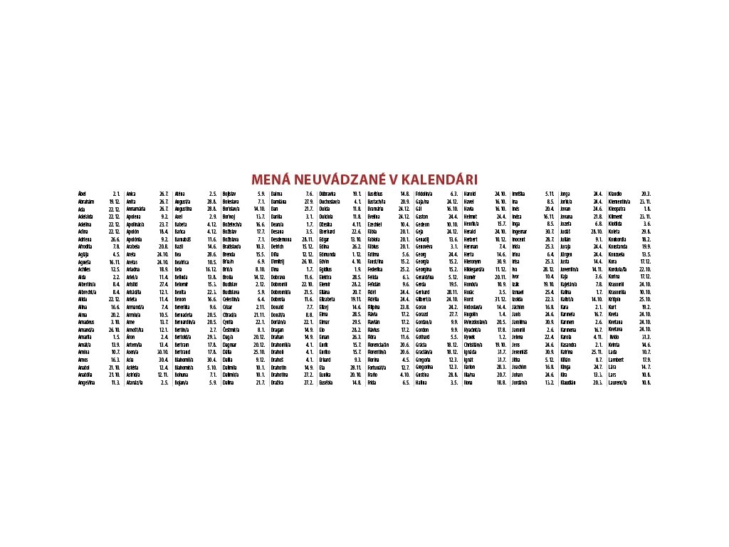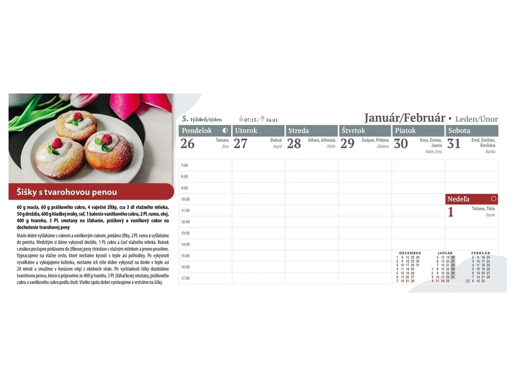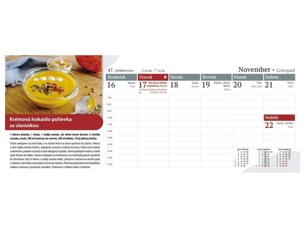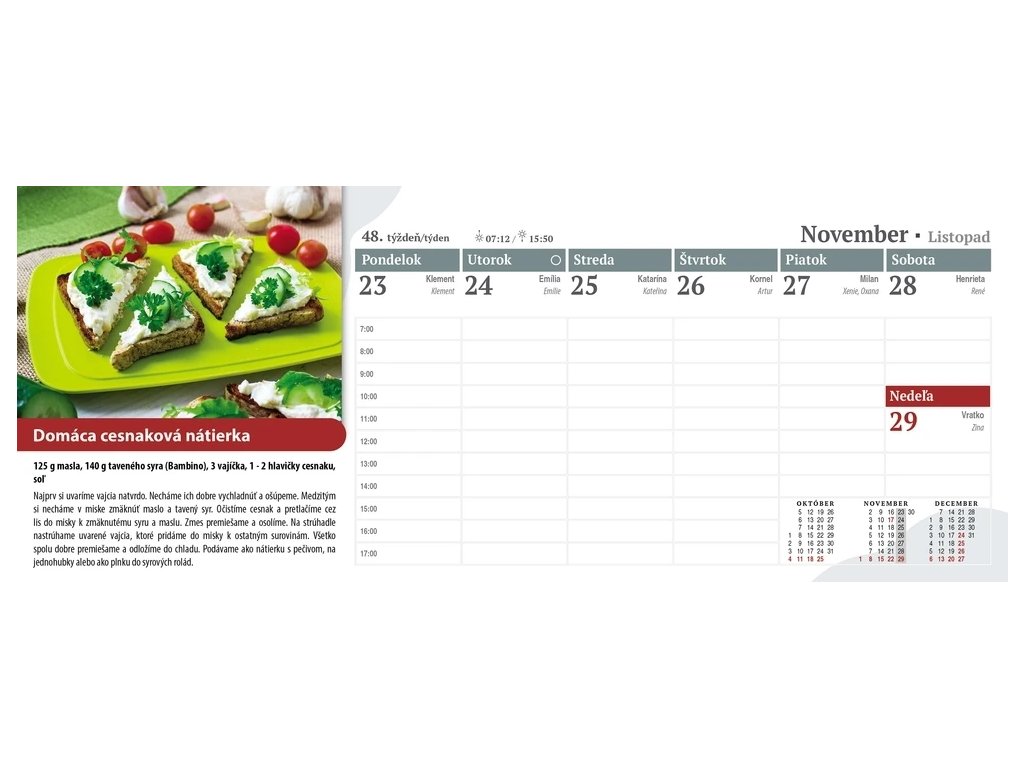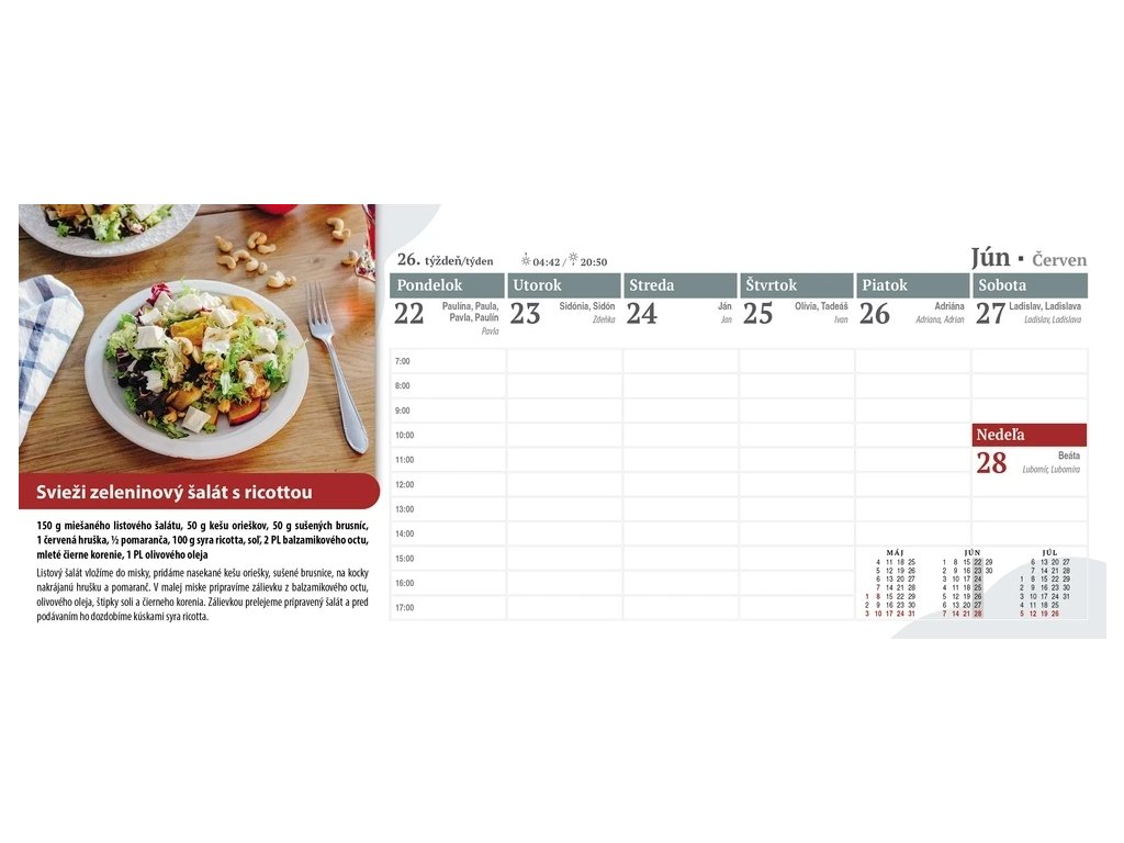 Kalendár Kuchárka je skvelou inšpiráciou na prípravu chutných a nenáročných jedál. Stolový týždňový stĺpcový kalendár s obrázkami a receptami jedál, doplnený o fázy Mesiaca, východy a západy Slnka, so slovenskými a českými menami (plus netradičné mená), vyznačenými štátnymi sviatkami oboch krajín aj susediacich krajín EÚ. Prajeme Dobrú chuť!