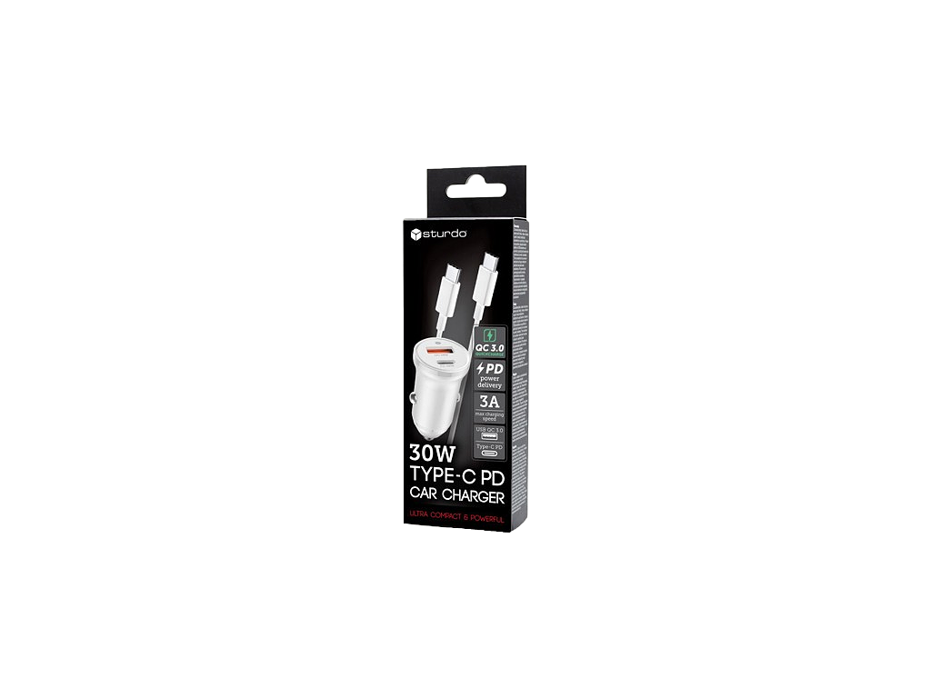 Sturdo autonabíjačka 30W (PD+QC 3.0) + 1M Type-C 60W kábel, biela, NAU-0050-STU-30WCC