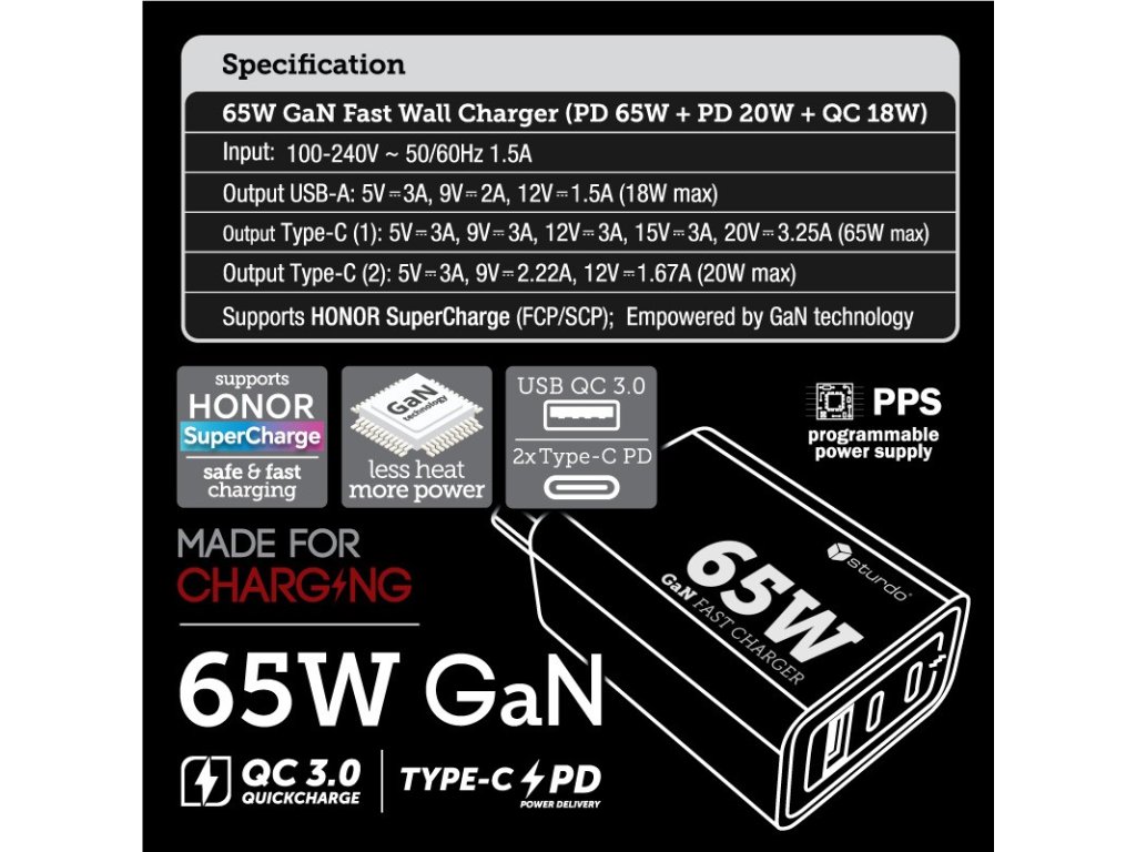 Podporované technológie: Honor SuperCharge (FCP/SCP), QC 3.0, USB-C PD, PPS