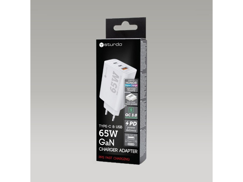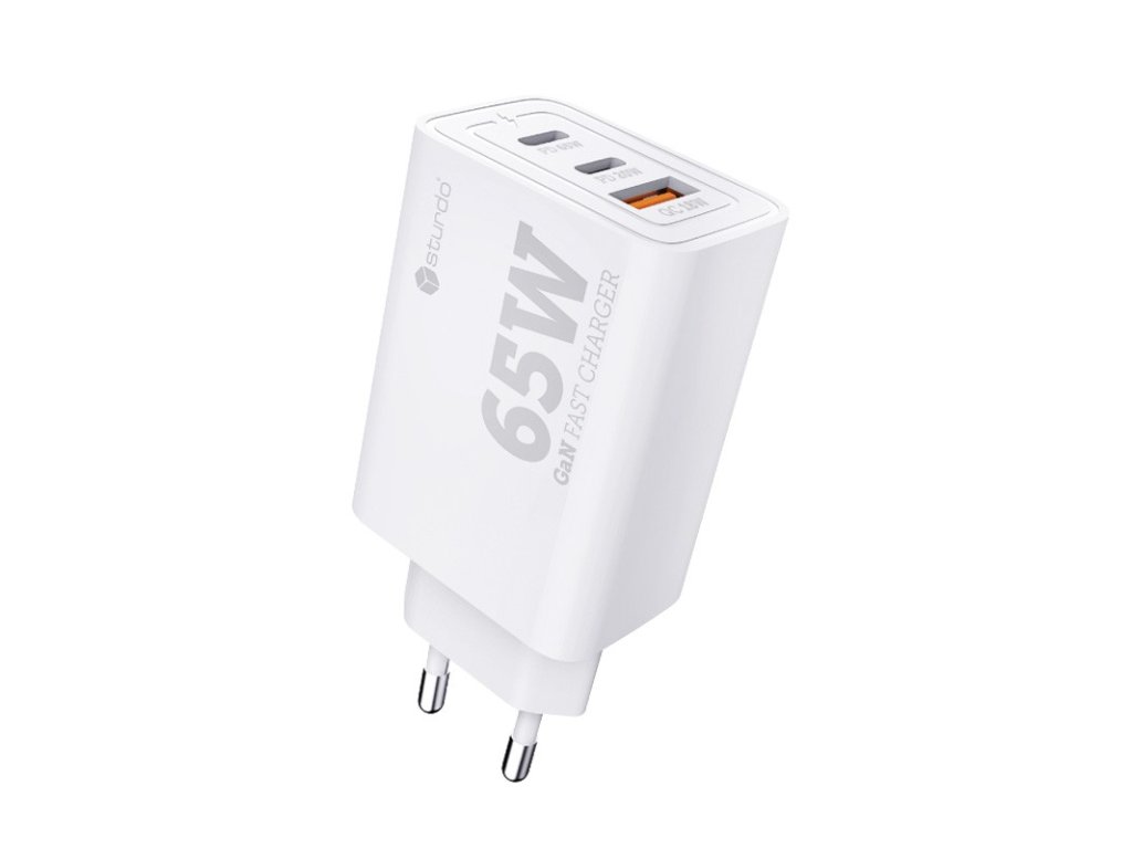 Sturdo sieťová nabíjačka GaN 65W, 2x Type-C PD + USB QC 3.0, biela NSI-0095-STU-GAN65